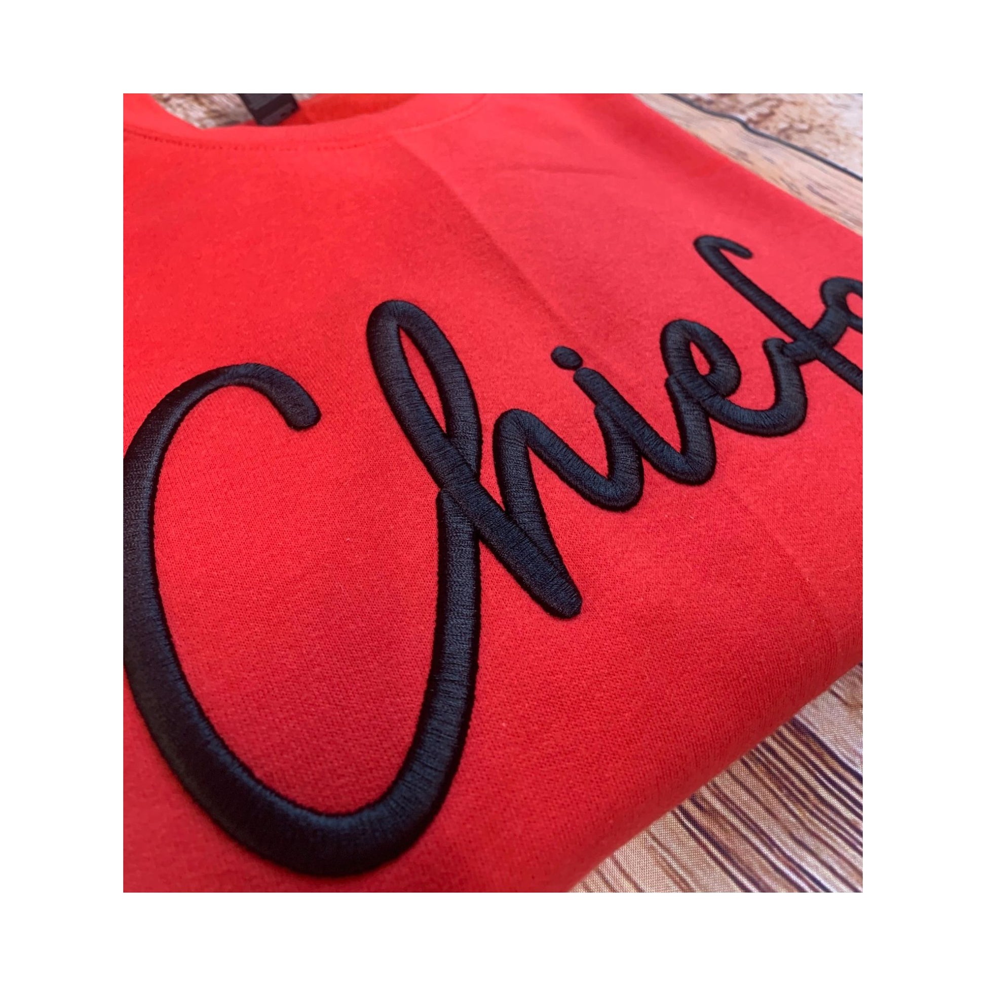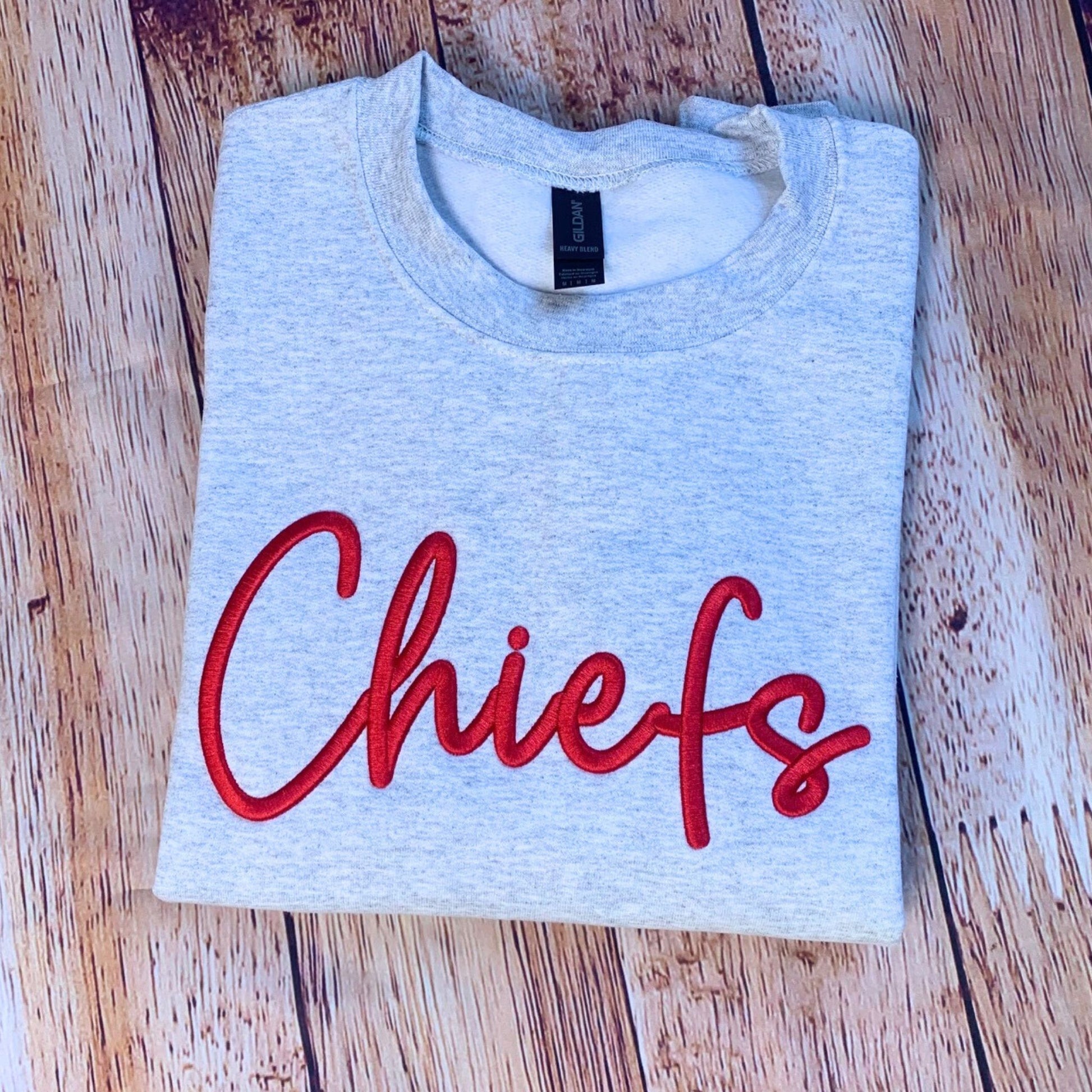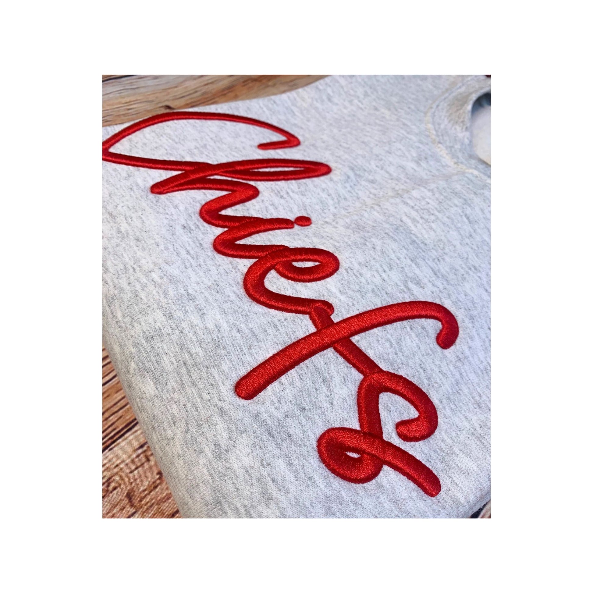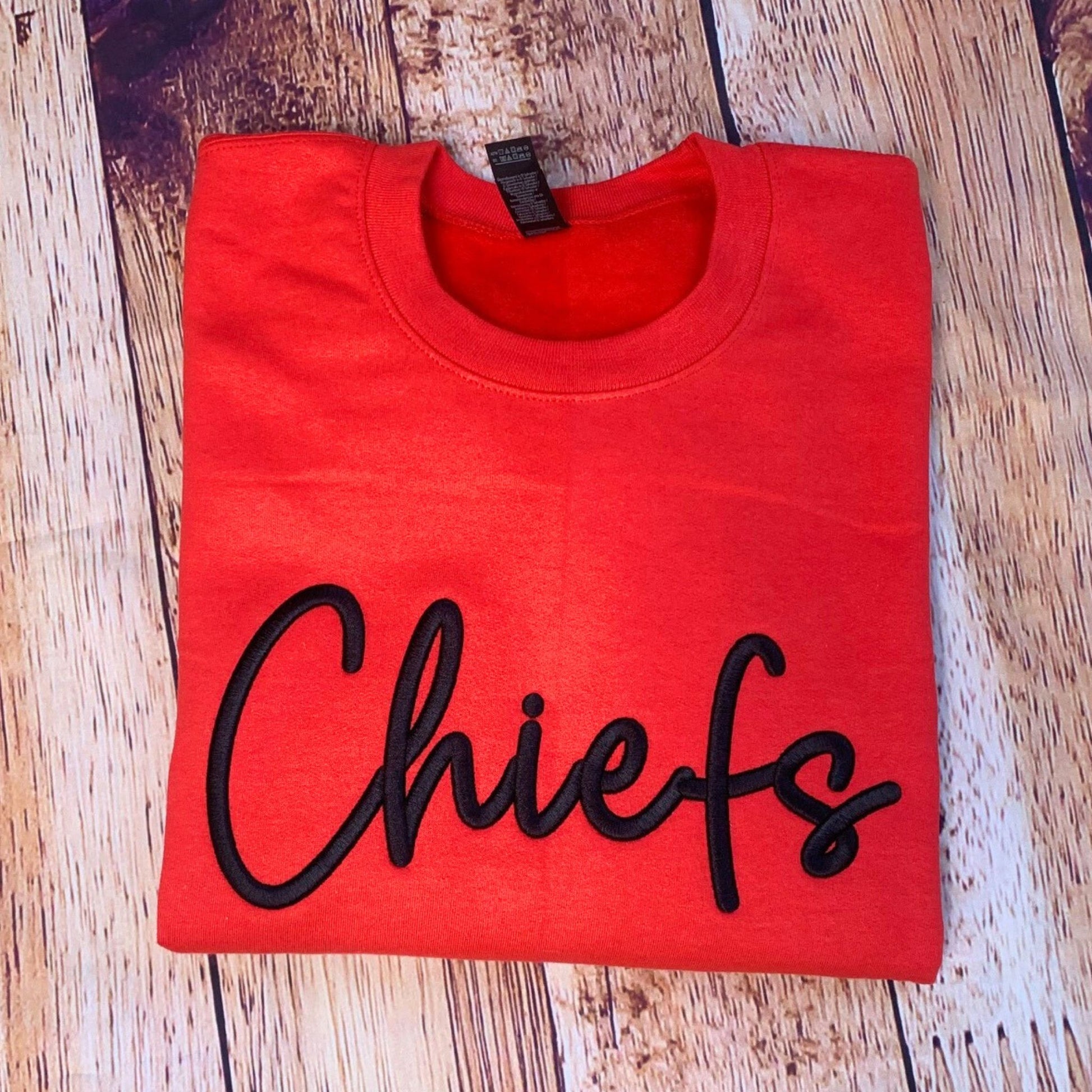 Get your hands on this super trendy, expertly embroidered puff Chiefs crewneck. Option to customize shirt & thread colors.