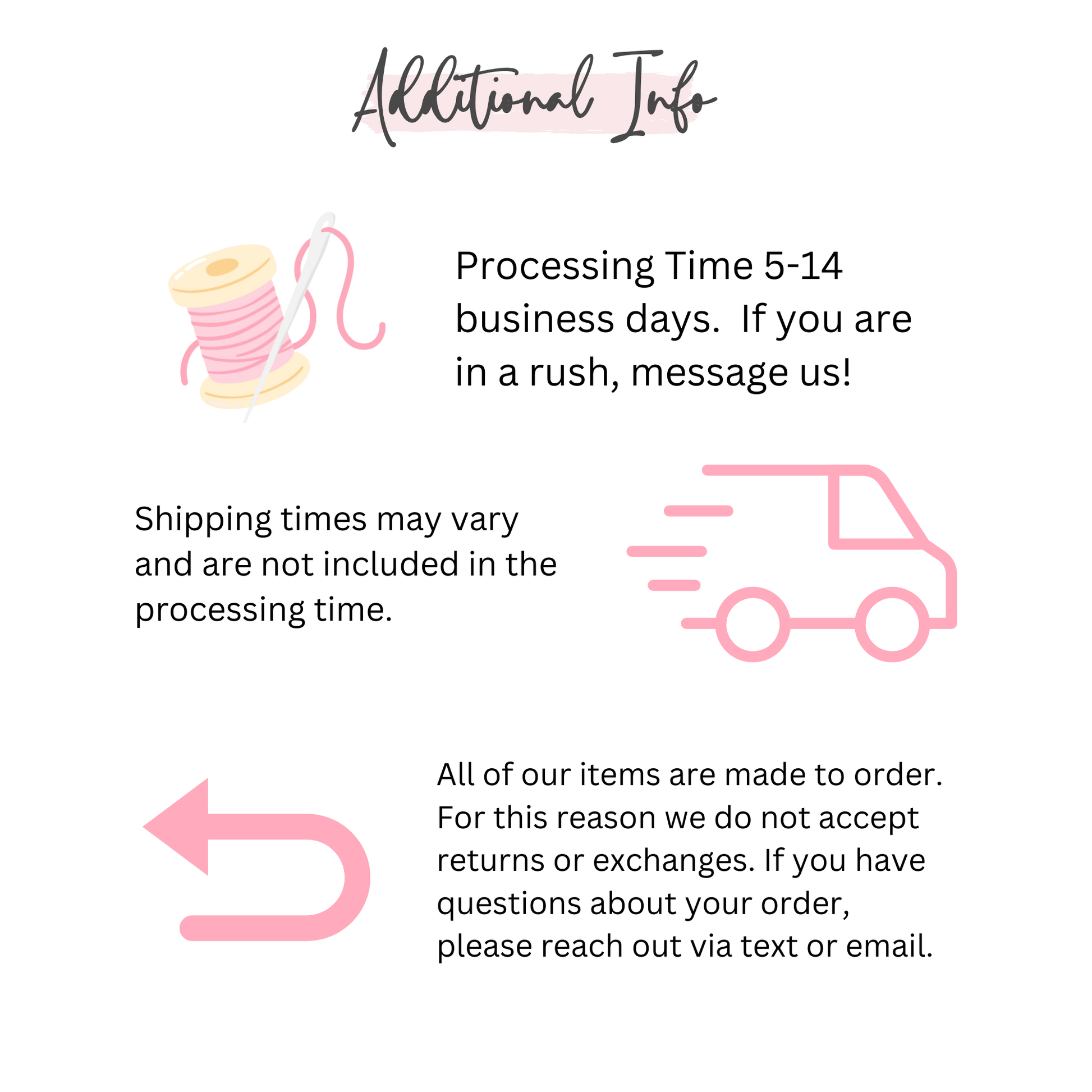 All shirts are made to order. Processing times may vary, but typically take 7-10 business days. This does not include shipping. Local Pickup in Basehor is also available.