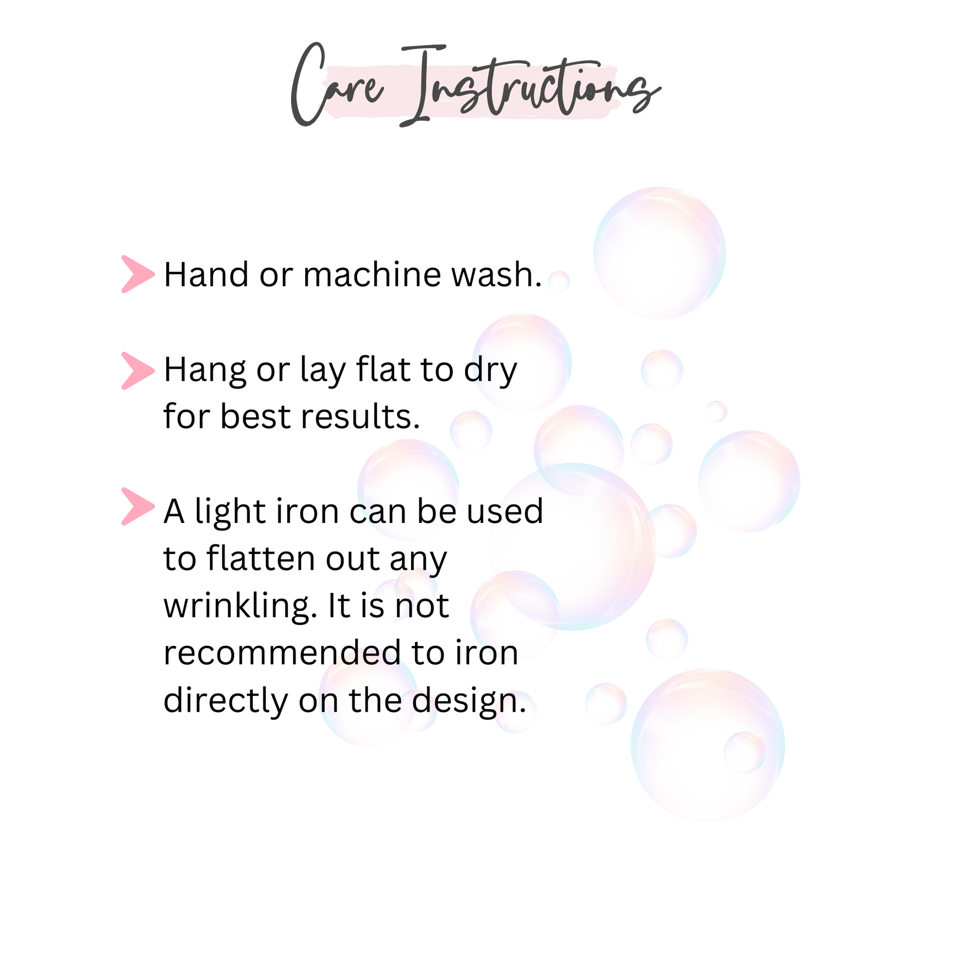 Care Instructions: Hand or machine wash. Hang or lay flat to dry for best results. A light iron can be used to flatten out any wrinkling. It is not recommended to iron directly on the design.