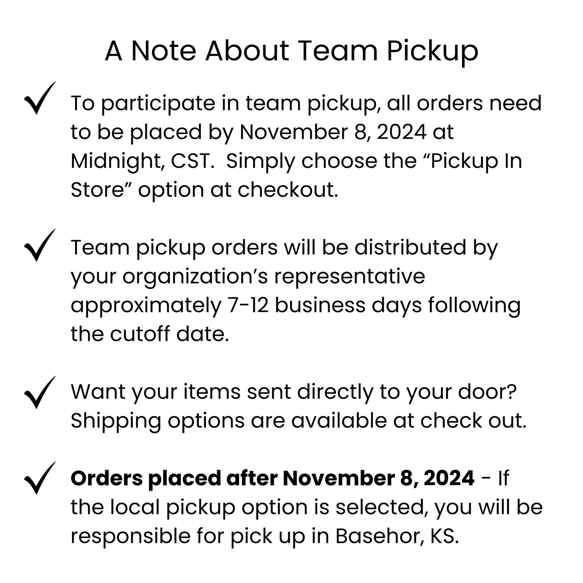 To participate in team pickup, all orders need to be placed by November 8, 2024 at Midnight, CST. Additional information on team pickup is provided in the product photos.